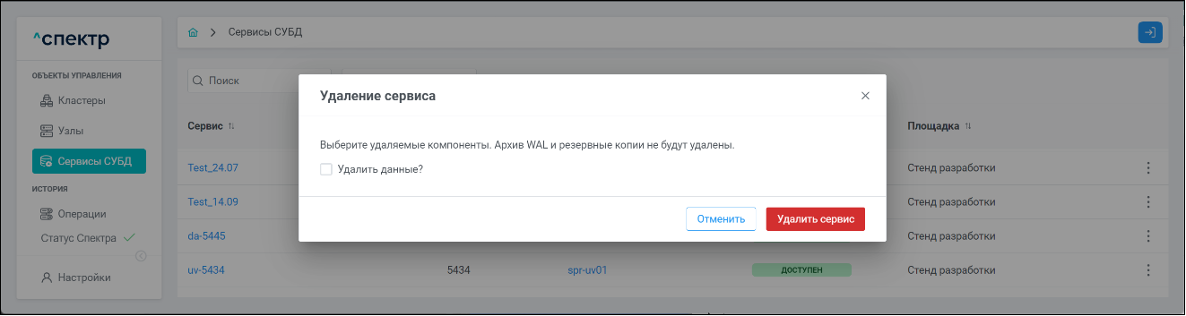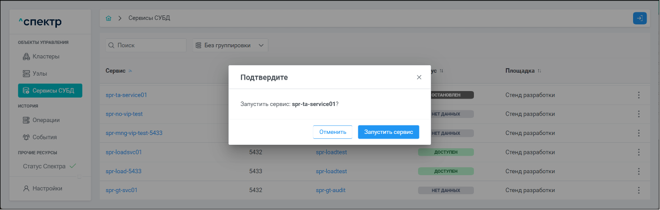 Для сервисов СУБД доступны операции: