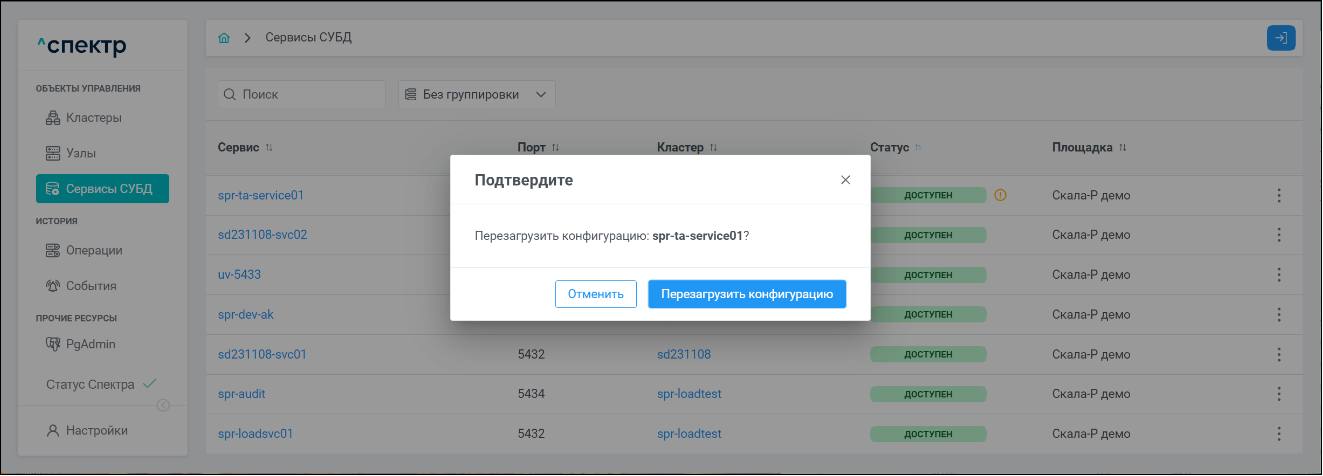 - на странице “Сервисы СУБД” справа от статуса сервиса, для которого были изменены и сохранены без применения параметры PostgreSQL, отображаются индикаторы необходимости перезагрузки конфигурации (reload)