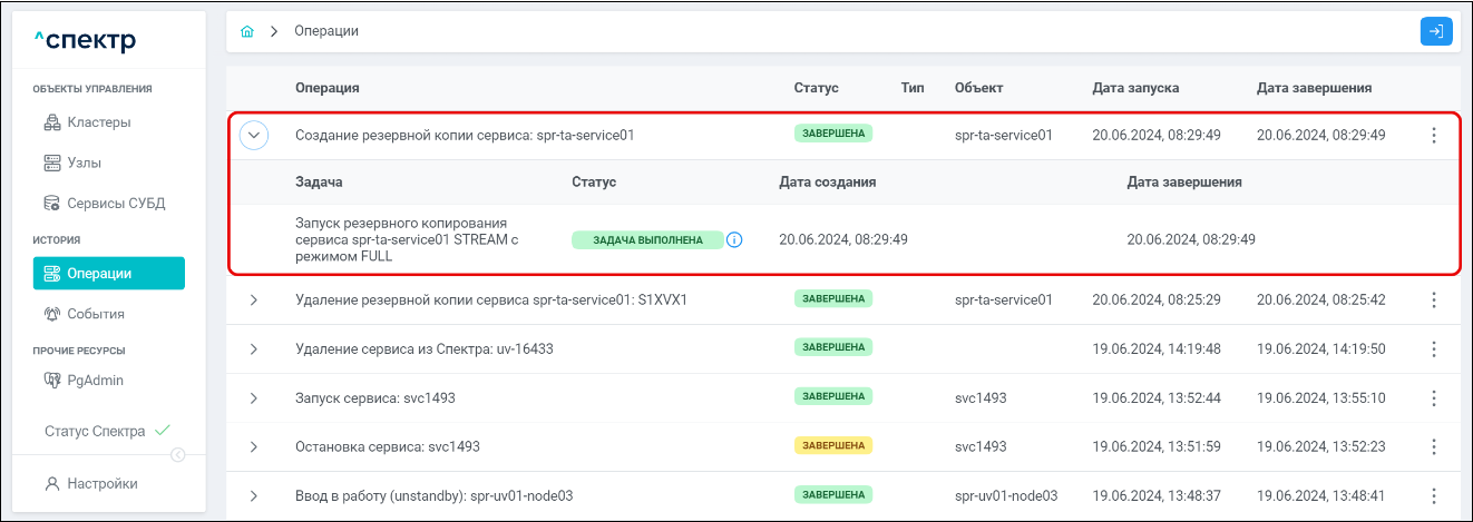 По нажатию кнопки “Перейти” во всплывающем сообщении будет осуществлен переход на страницу “Операции”. Операция изменения параметров pgconfig со статусом “НОВАЯ” и, далее, со статусом “ЗАВЕРШЕНА” появится в верхней строке. Для раскрытия / скрытия списка задач операции с актуальными статусами выполнения нужно нажать на элемент управления