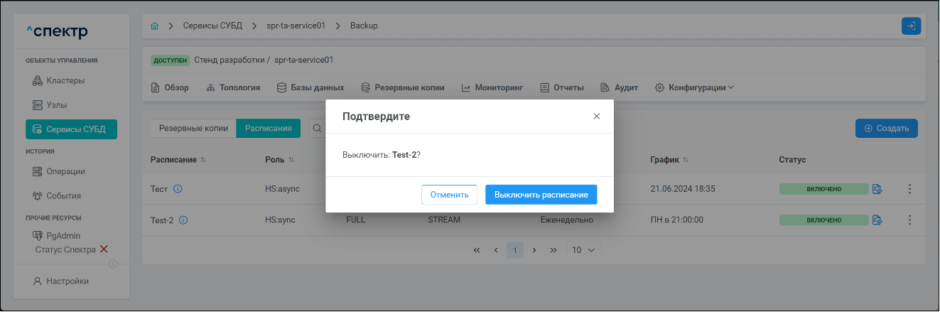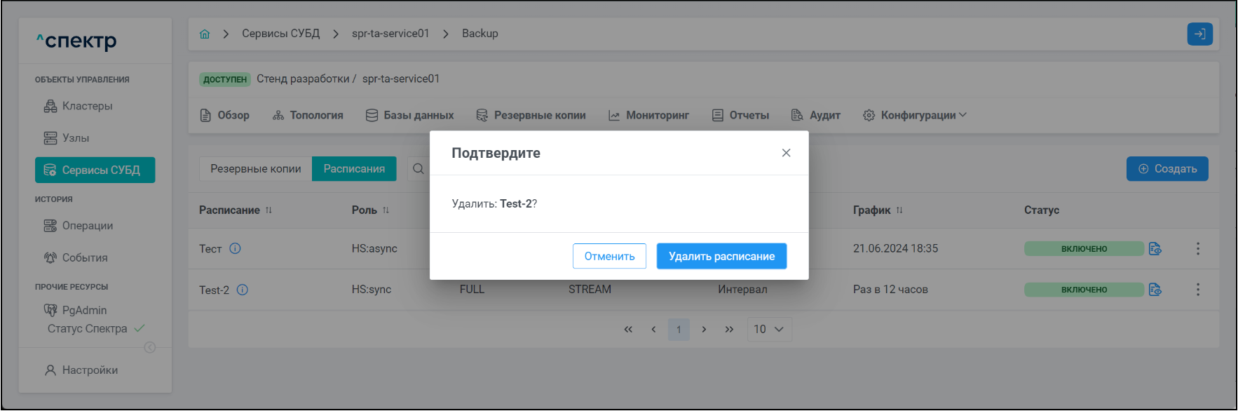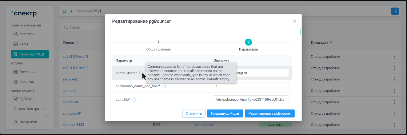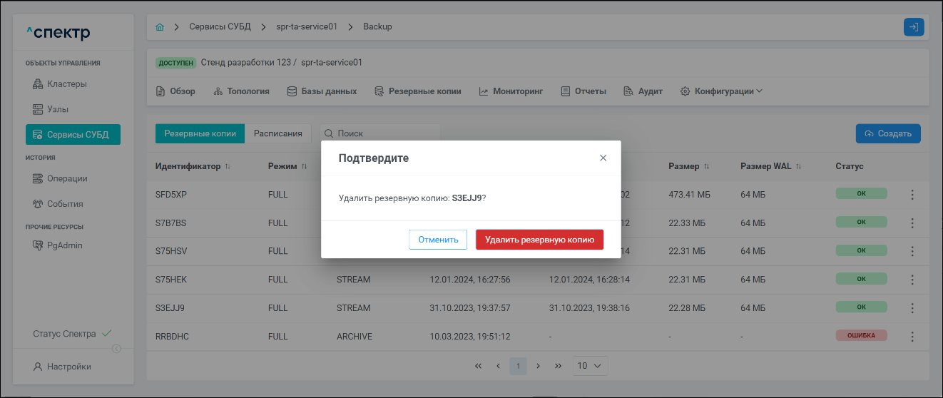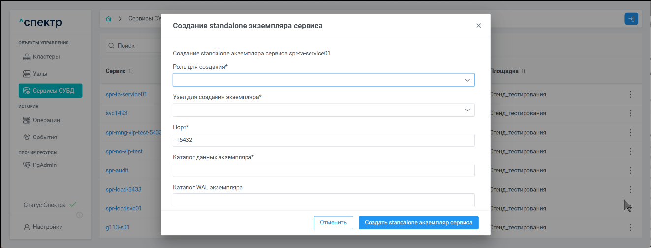 | Экземпляр сервиса СУБД | Работающий на конкретном узле набор процессов PostgreSQL определённой версии. Всегда принадлежит одному сервису СУБД. На узле могут работать несколько экземпляров СУБД, для этого могут использоваться техники изоляции между ними (например, контрольные группы). |