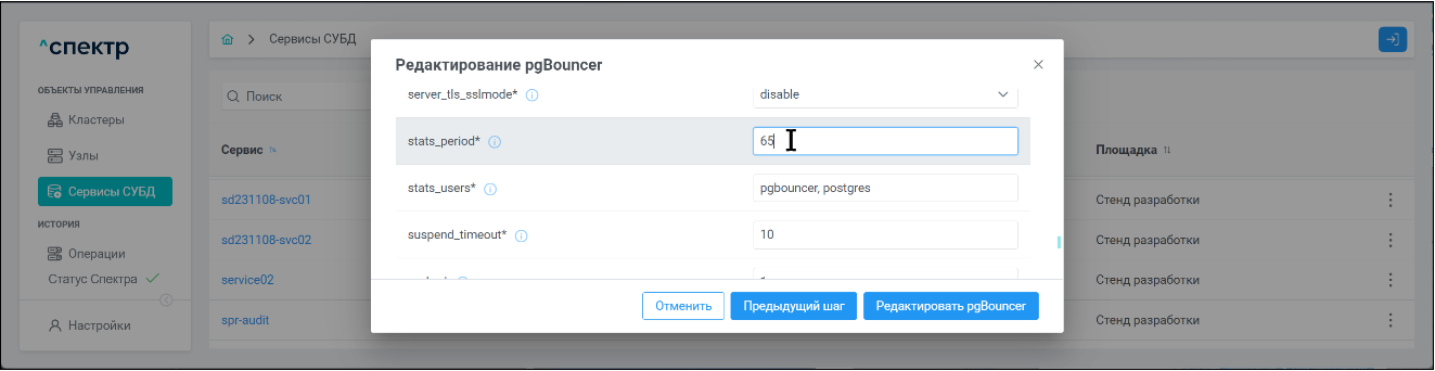 | Не отображаются текущие действующие значения конфигурации Postgres при редактировании не через ПО “Скала^р Спектр”. | Если изменения в конфигурацию Postgres вносятся напрямую через файлы конфигурации или с использованием SQL-оператора ALTER SYSTEM, и при этом не конфигурация не перезагружается, то в веб-интерфейсе ПО “Скала^р Спектр” можно увидеть только новое значение параметра, которое еще не действует, а текущее действующее значение параметра увидеть нельзя. | Выполнять перезагрузку конфигурации сервиса при редактировании параметров через файлы или редактировать параметры через ПО “Скала^р Спектр”. |