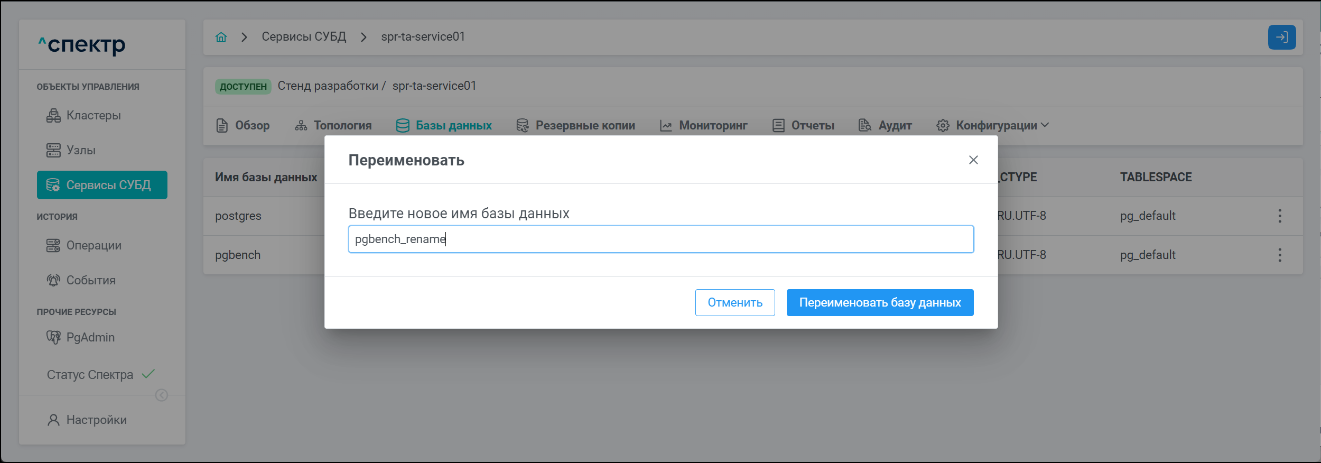 - В окне подтверждения переименования ввести новое имя БД и нажать на кнопку “Переименовать базу данных”: