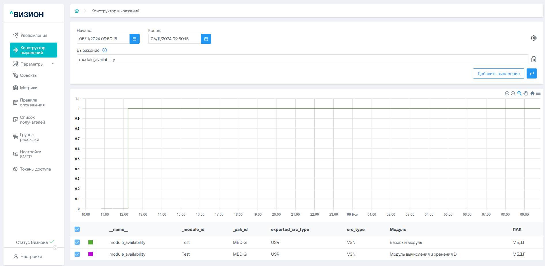 Концептуально внутри запроса лежит join, который заполняет метрику данными из промежуточных, создаваемых пользователем, метрик доступности каждого модуля. С помощью функции label_set новая метрика обогащается метками “Модуль” и “ПАК”. Значения временного ряда будут получены из значений метрик, используемых в качестве первого аргумента label_set
