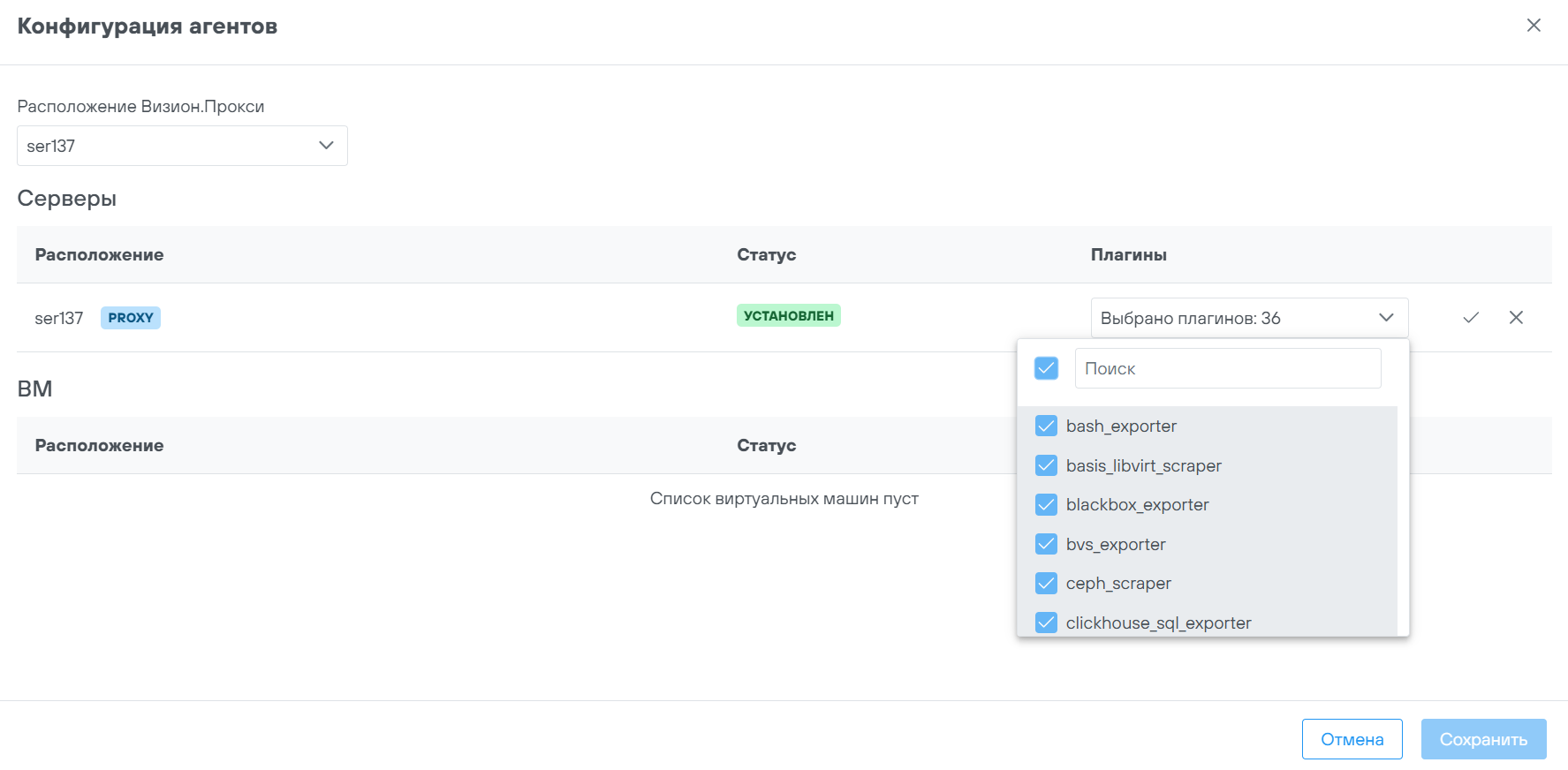 В состав дистрибутива опционально включается плейбук развертывания агента Платформы, необходимый для взаимодействия сервера Визиона с сервером для конфигурирования агентов мониторинга. Данный агент необходимо развернуть на все узлы, на которые в последствии будут установлены Визион.Агент и Визион.Прокси.