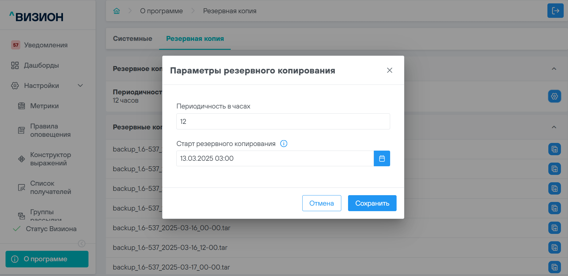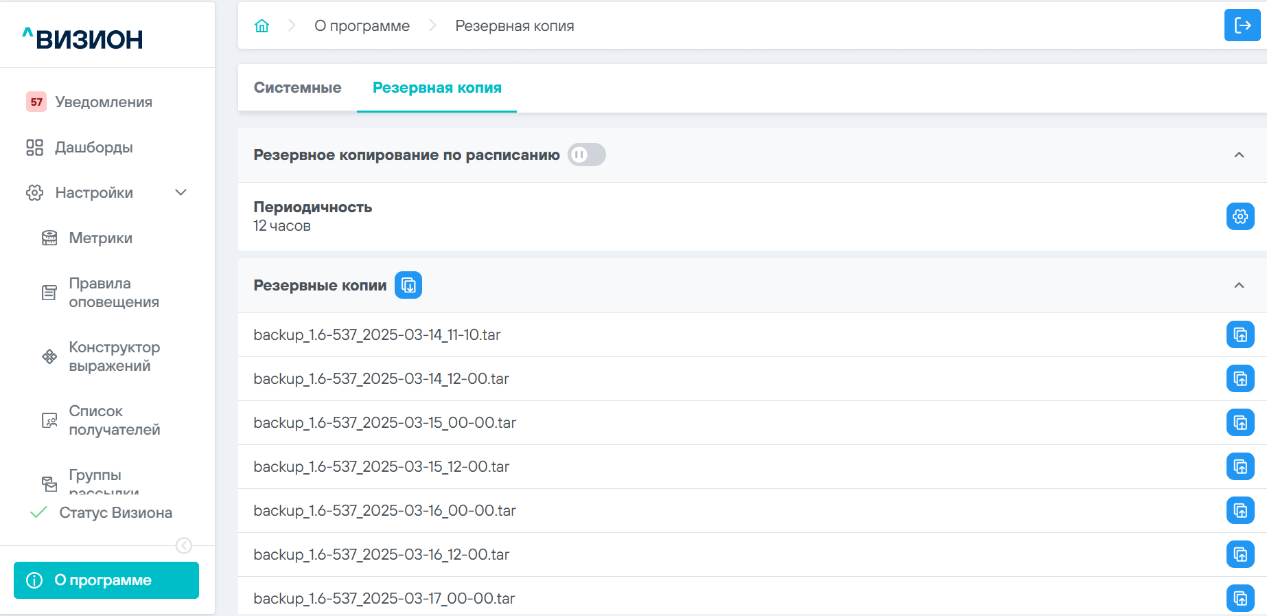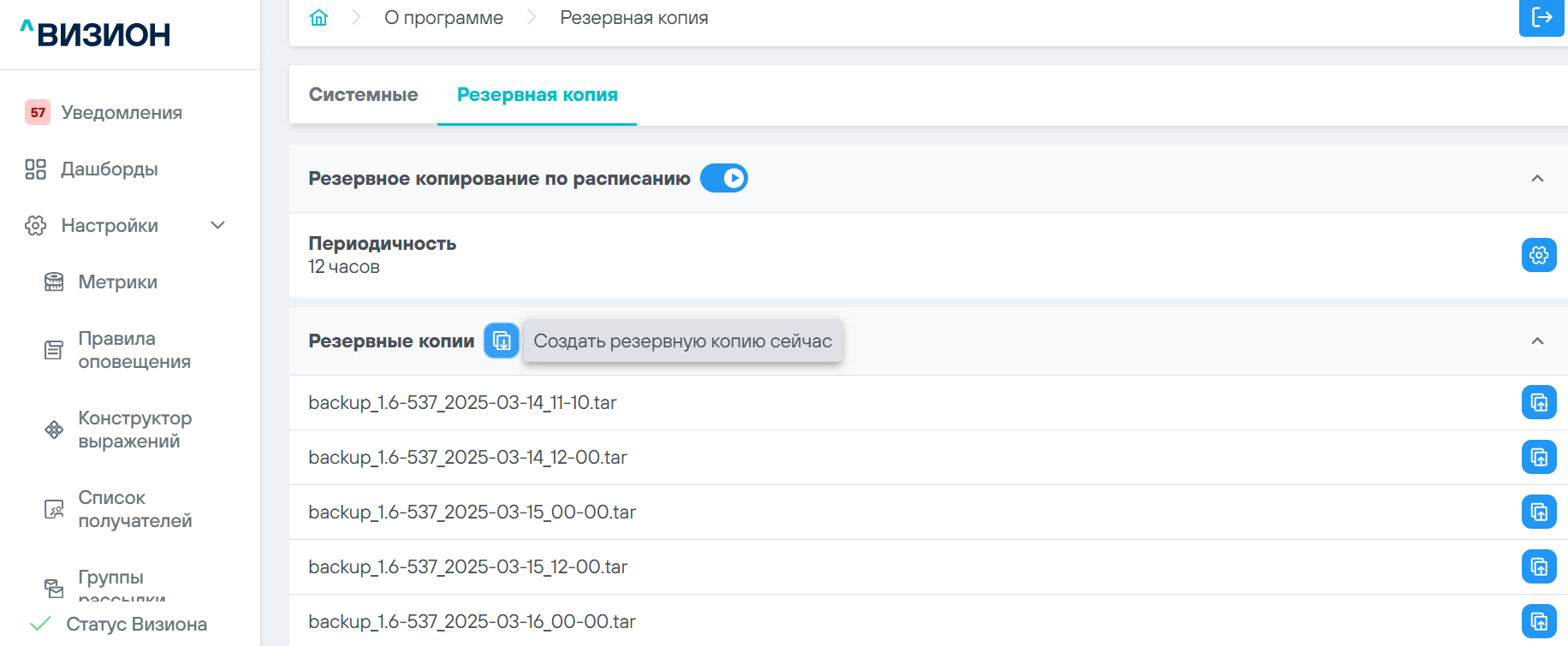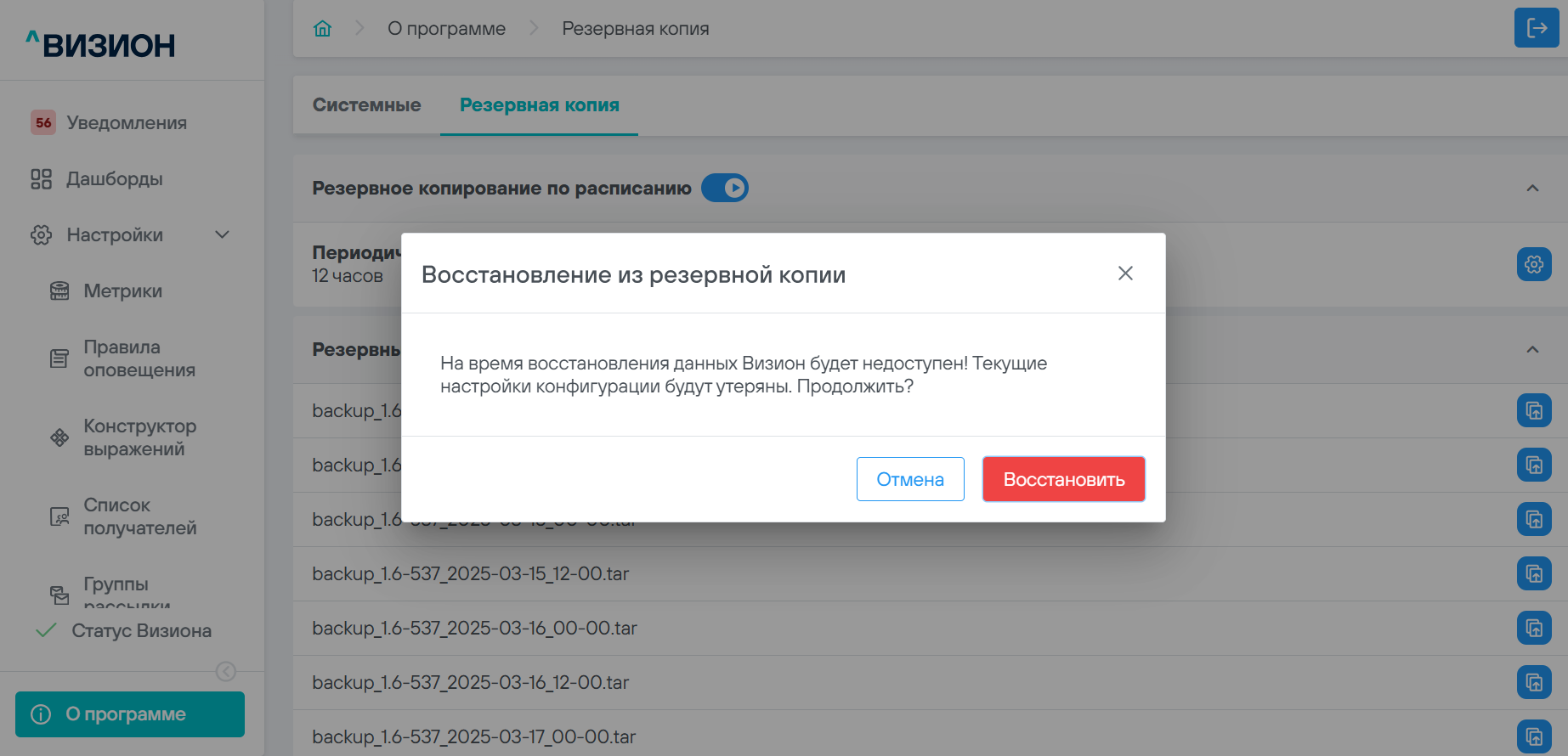 ПО Визион позволяет создавать и восстанавливать резервные копии своей конфигурации.