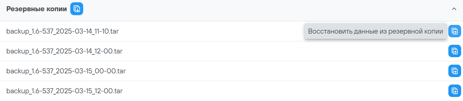 Для восстановления данных из резервной копии необходимо рядом с созданной резервной копией в разделе “Резервные копии” нажать на кнопку “Восстановить данные из резервной копии”.