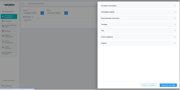 - Аналитические панели: переход осуществляется в сервис графического отображения метрик на информационных панелях в виде графиков, отдельных значений, диаграмм, таблиц