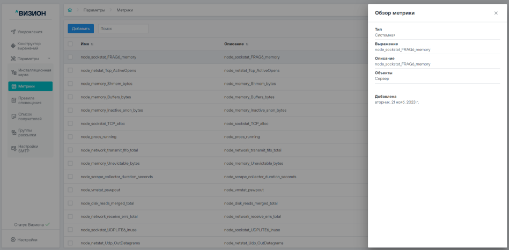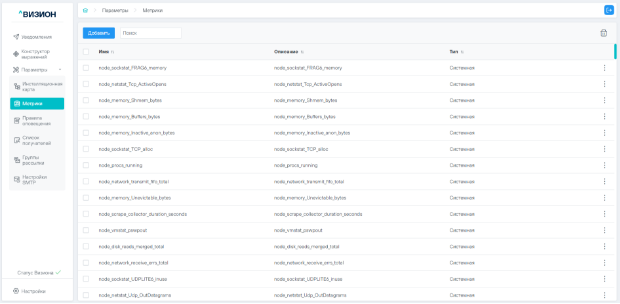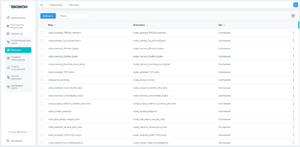 Подраздел «Метрики» содержит информацию о добавленных пользователем и системных метриках (метрики, собираемые экспортерами «из коробки») и формы для работы с ними.