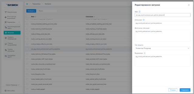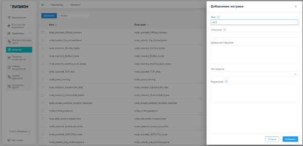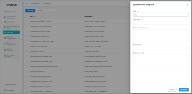 - Имя – Системное имя метрики, задается для настроек других связанных сущностей, например, правил оповещений;