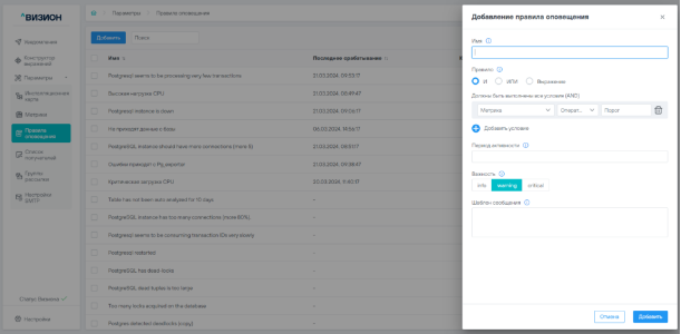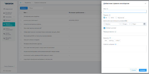 Форма «Добавление правила оповещения»