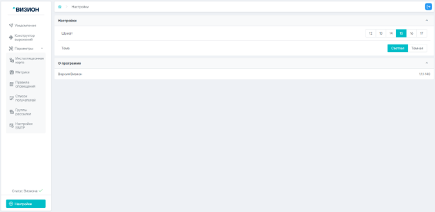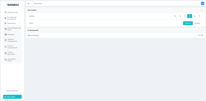 Так же в текущем разделе отображается информации о версии ПО Визион.