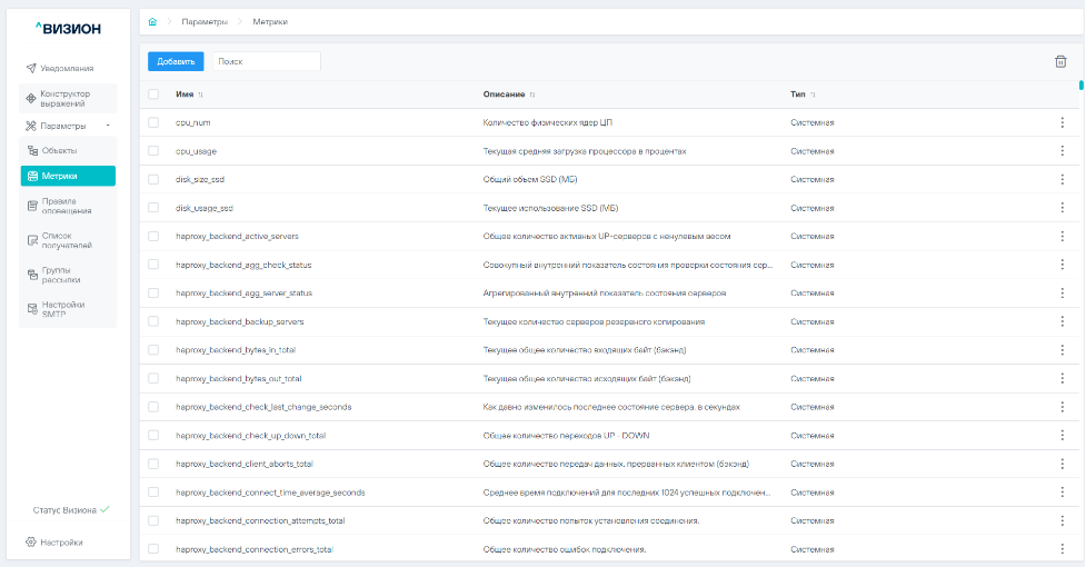 • Метрики - список метрик, соответствующий типу объекта.