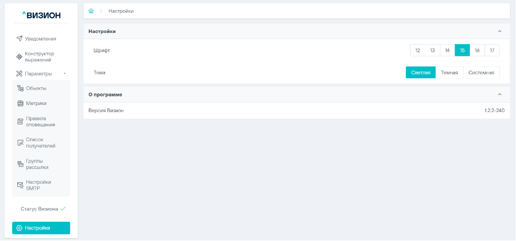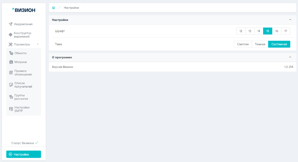 Так же в текущем разделе отображается информации о версии ПО Визион.