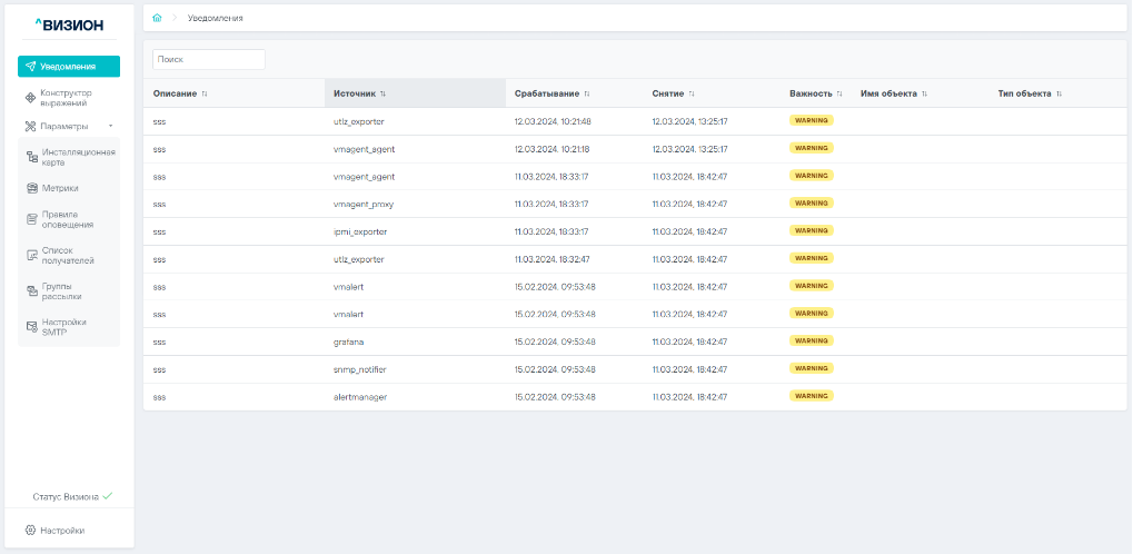 Раздел «Уведомления» содержит панель уведомлений мониторинга