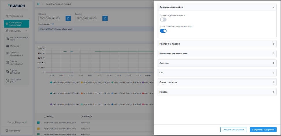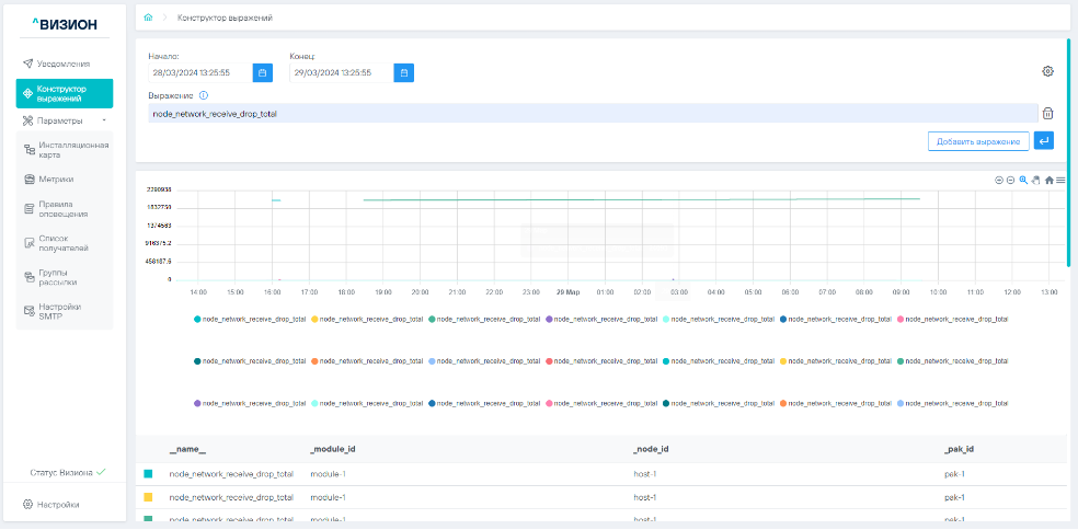 Раздел «Конструктор выражений» это инструмент для анализа метрики в графическом виде. Под графиком формируется таблица с описанием временных рядов: их лейблы (метки) и значения