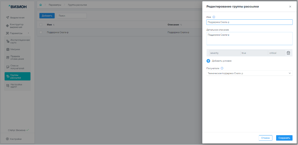 Вносим необходимые изменения и нажимаем кнопку «Сохранить». Редактирование условий рассылки в ранее созданной группе в текущей версии Визиона не предусмотрено.