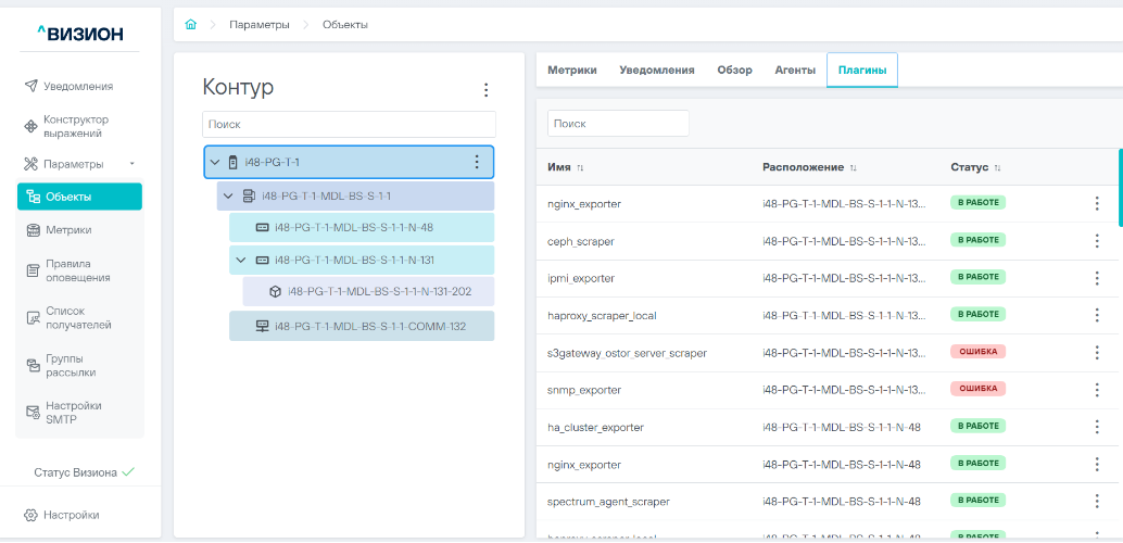 - Визион.Сервер - предоставляет функционал единой точки доступа к управлению мониторингом; устанавливается в одном экземпляре на контур (совокупность ПАК);