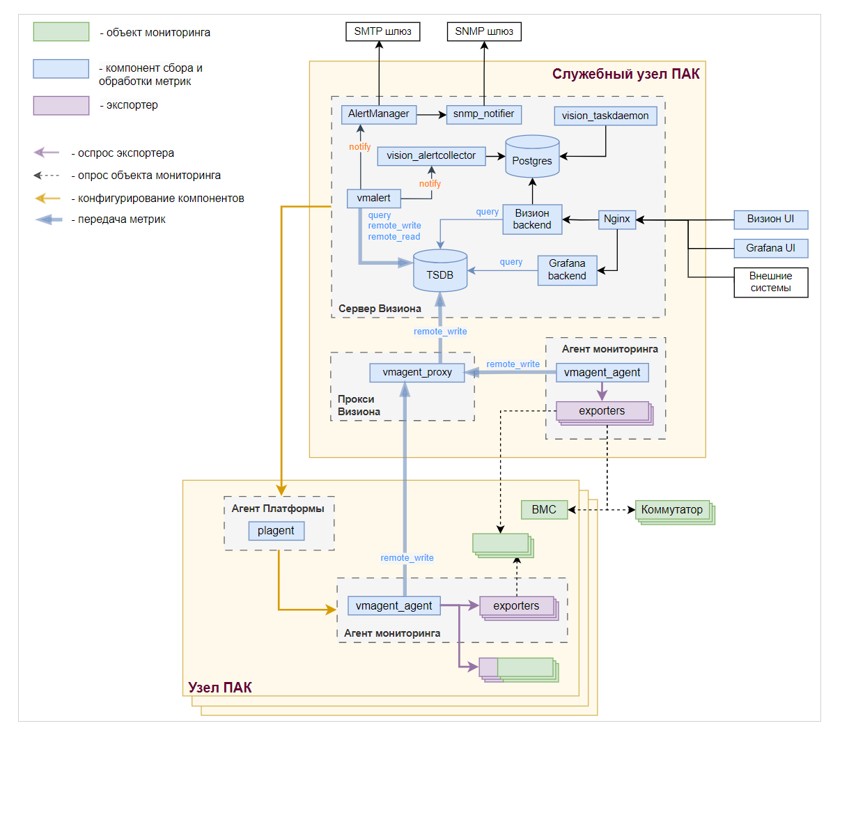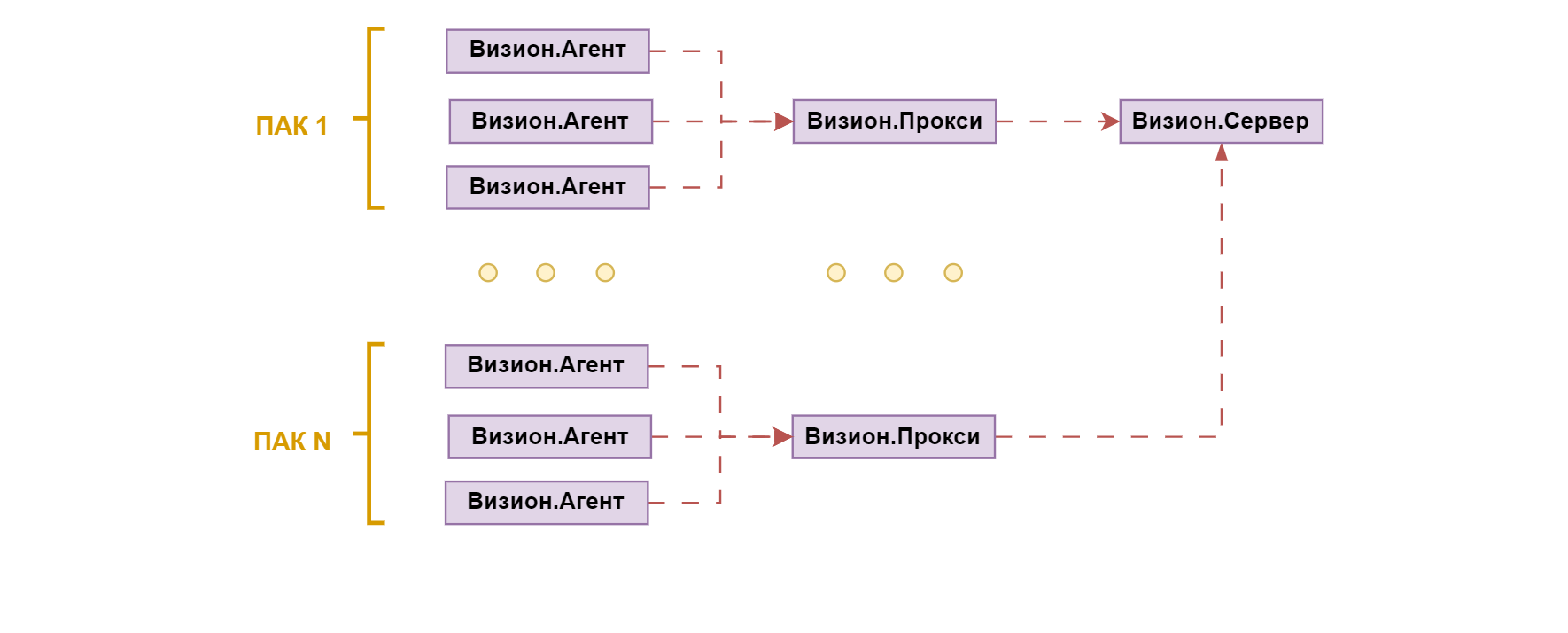 - Визион.Прокси - промежуточное звено, аккумулирует метрики с узлов ПАК; устанавливается по одному на каждый ПАК, возможно совмещение с сервером Визиона при использовании единой точки Визиона в каждом ПАК (Машине);