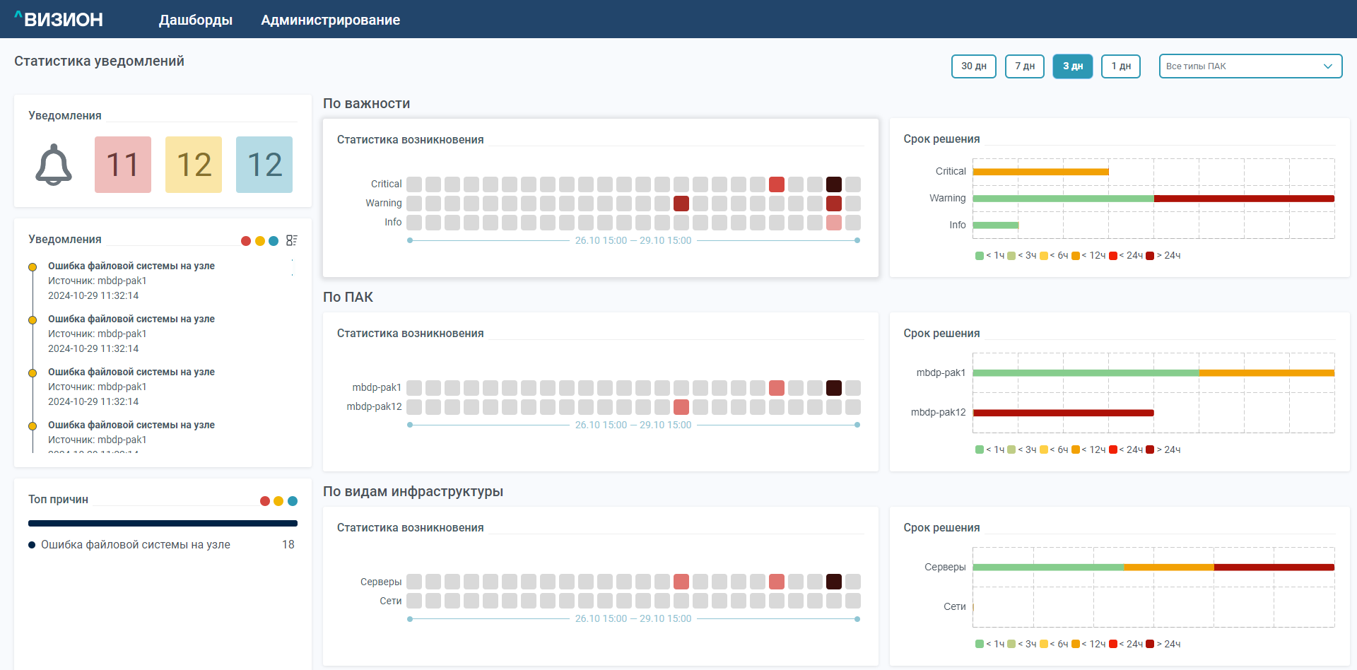 - Тепловая карта по важности, ПАК и видам инфраструктуры, отражающая количество уведомлений в разрезе по дням в виде цветовых индикаторов (чем темнее цвет, тем больше уведомлений)