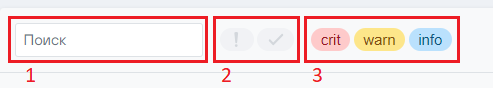 Над списком уведомлений расположены поле “Поиск” (1) и быстрые фильтры - фильтр активности (2) и фильтр критичности (3):